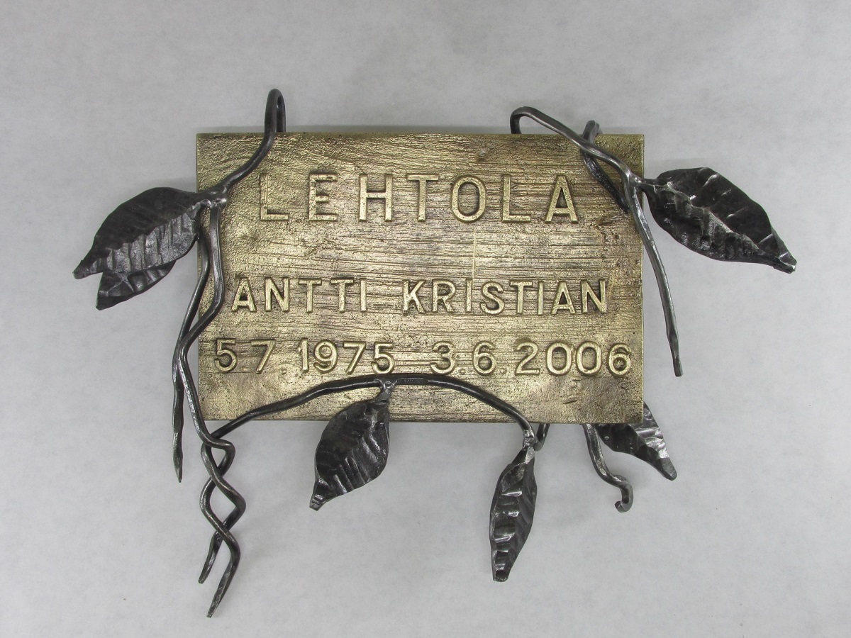 18 x 11,5cm pronssilaatta takorautaisella kehyksellä ja kohokuvioisella tekstillä.