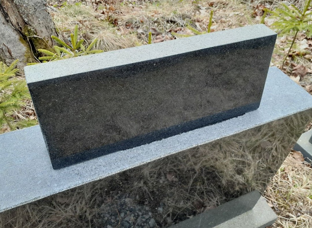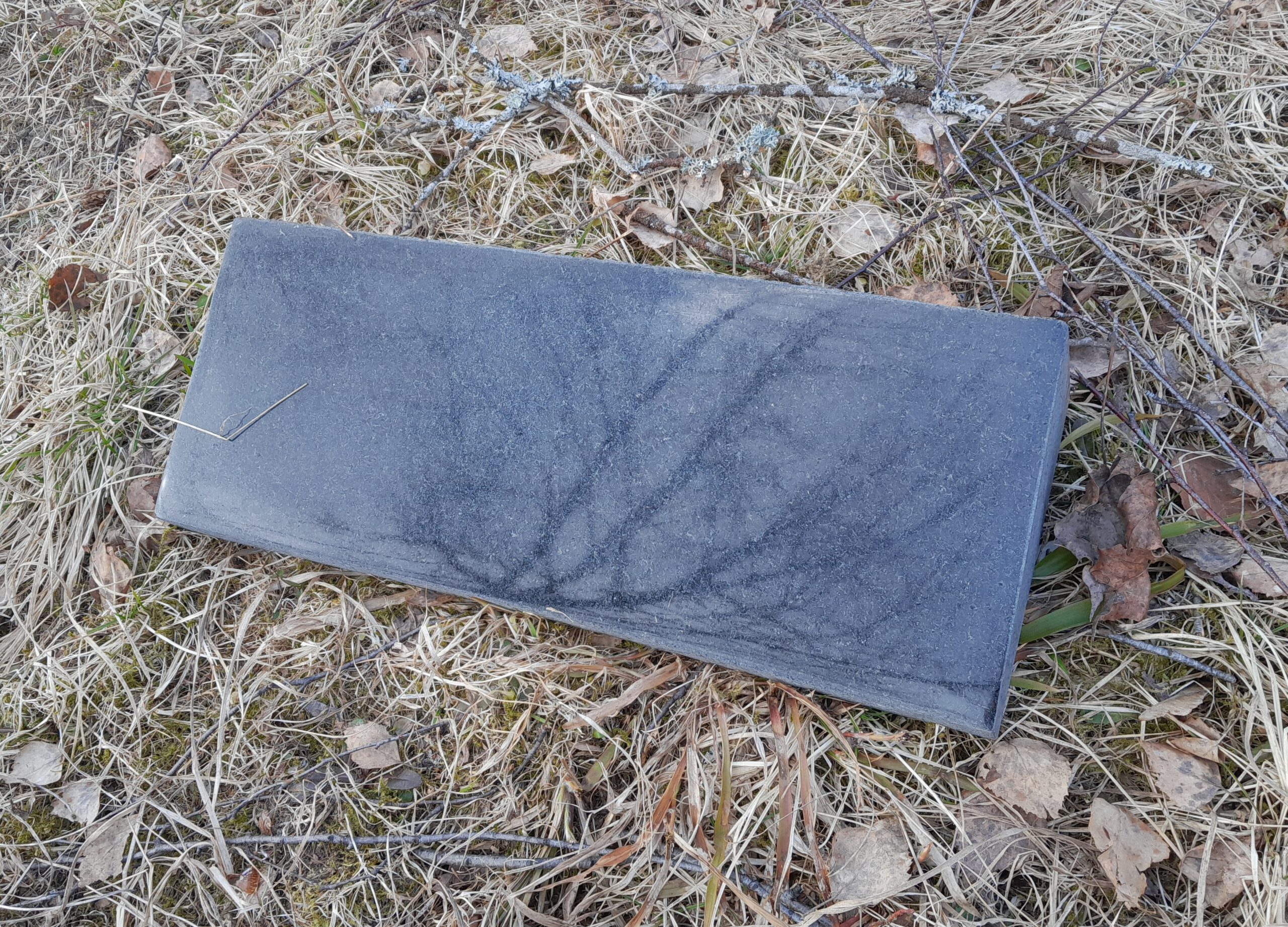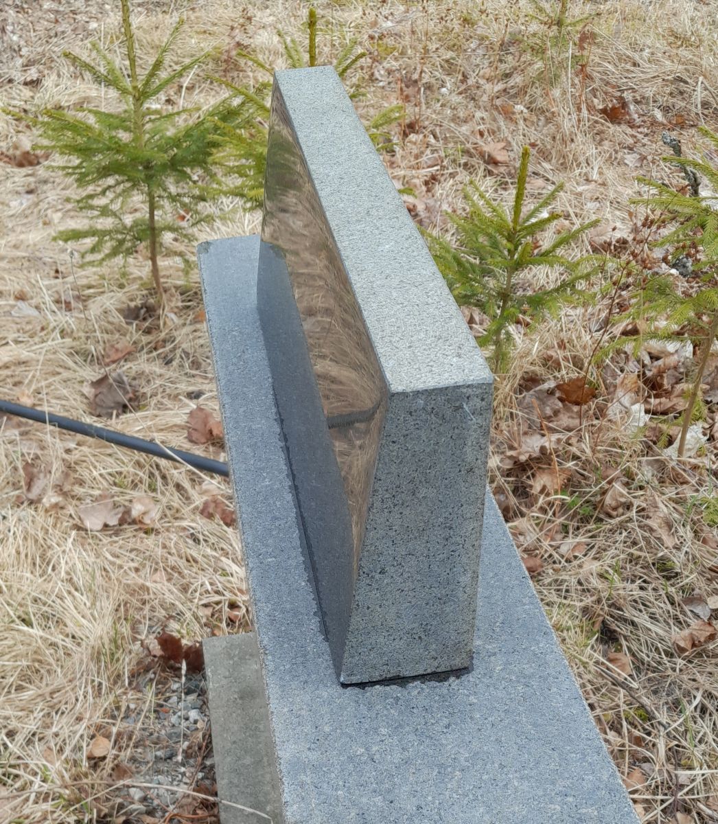 Uusio hautakivi, musta diabaasi, kiilloitettu pinta, sahatut reunat.