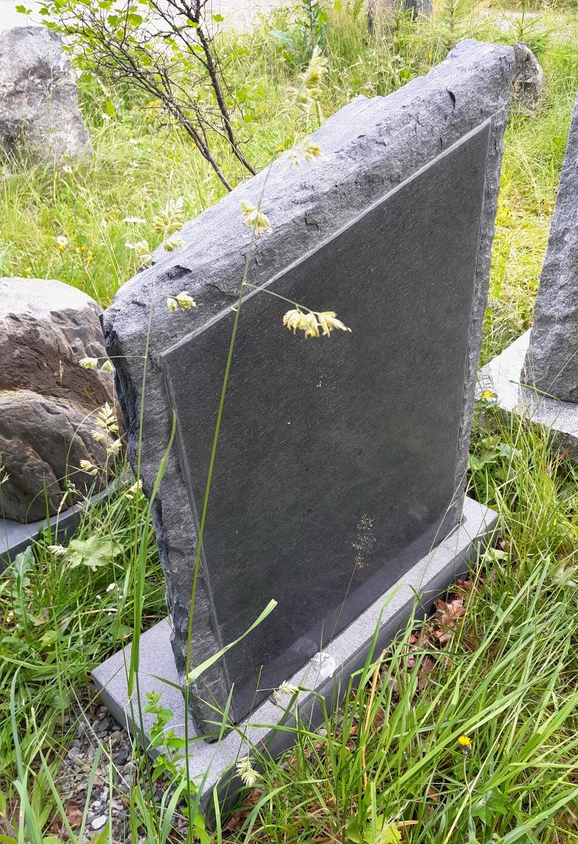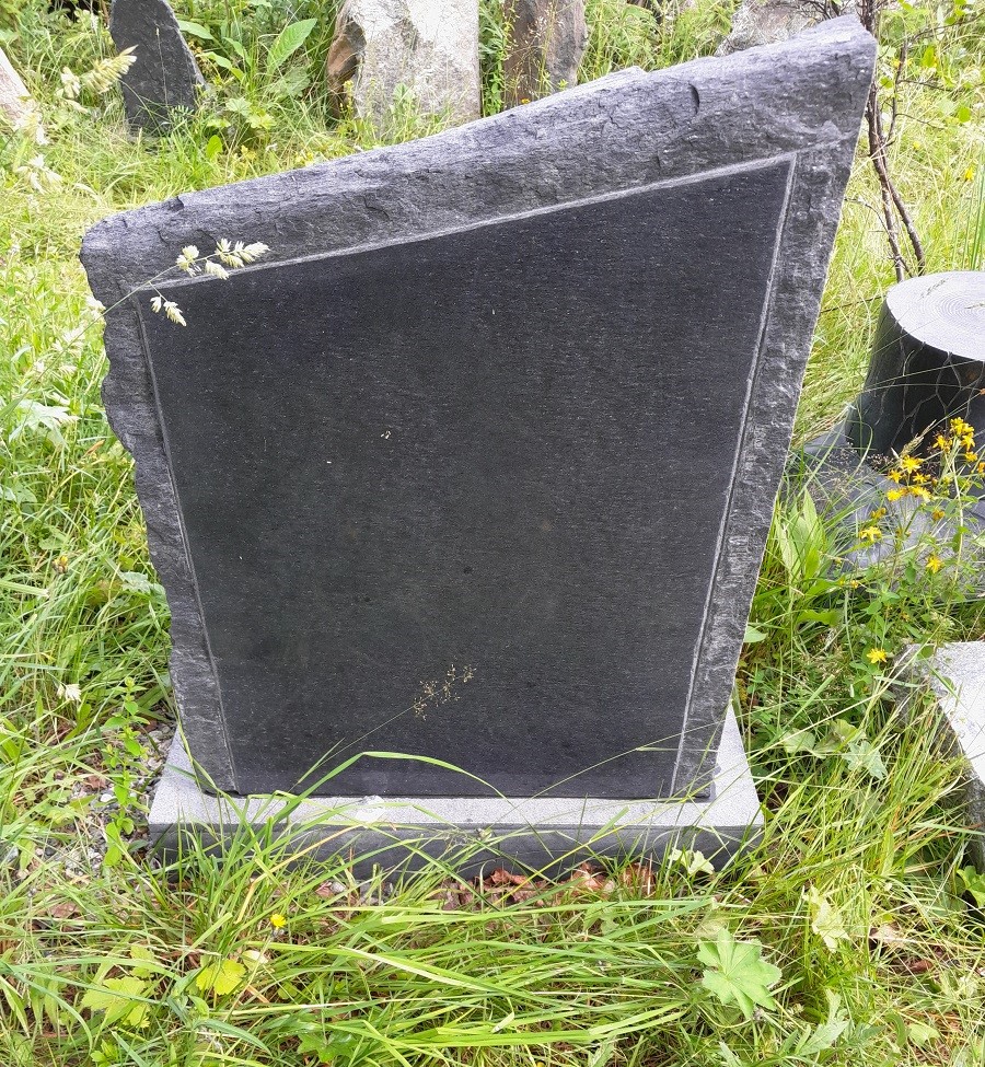 Liuskekivestä valmistettu hautakivi. Vasen laita ja päällinen lohkoreunaa, oikea reuna sahattu, pinta kiilloitettu.