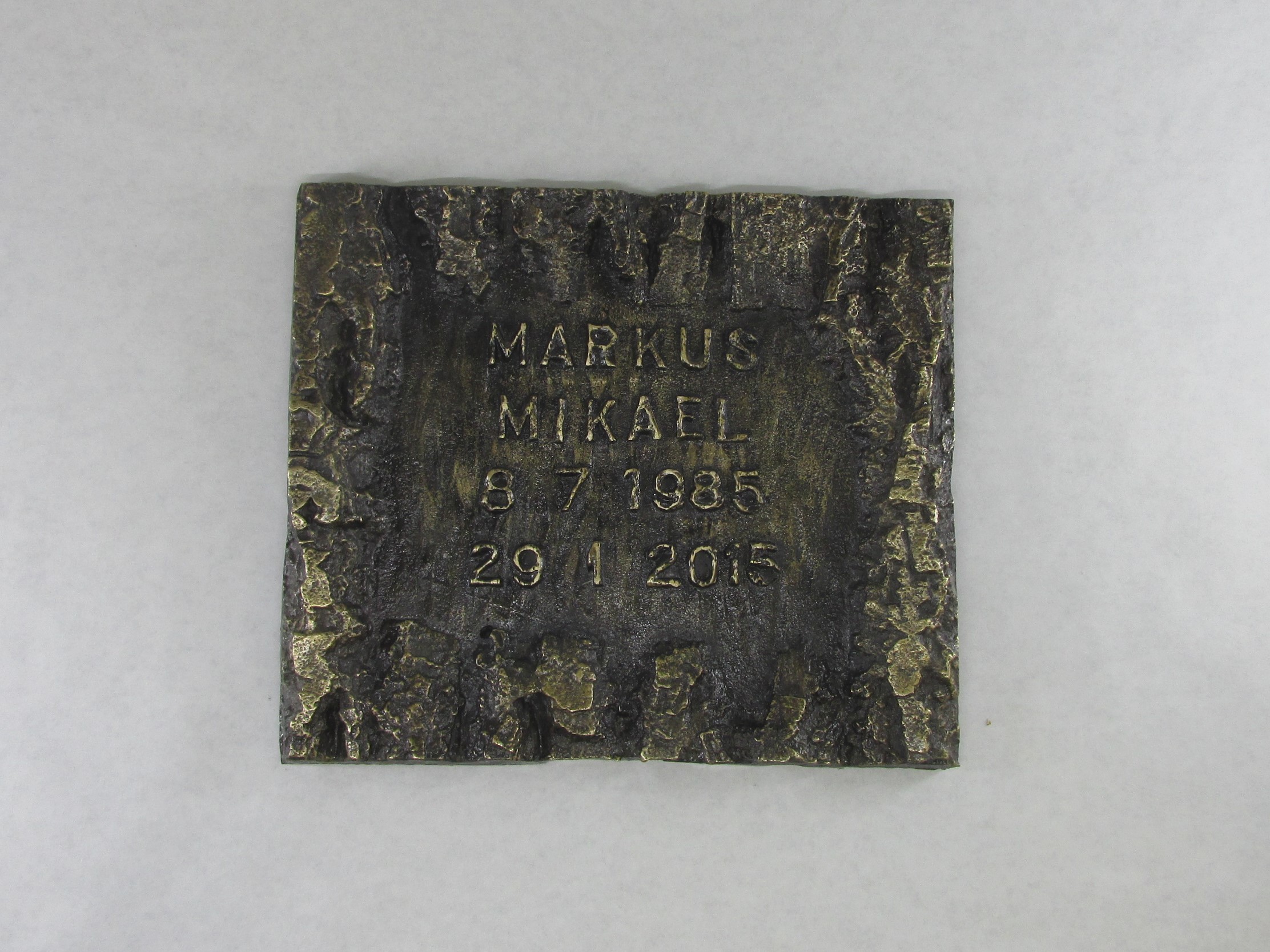 20 x 17 cm kaarnakehyksinen pronssilaatta kohokuvioisella tekstillä.