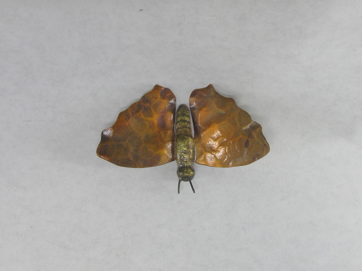 Pronssinen perhonen kuparisilla siivillä ja rosteri tuntosarvilla. Perhosen pituus 6cm ja siipien kärkiväli 9,5cm. Lämpöpatinoitu ja lakattu.