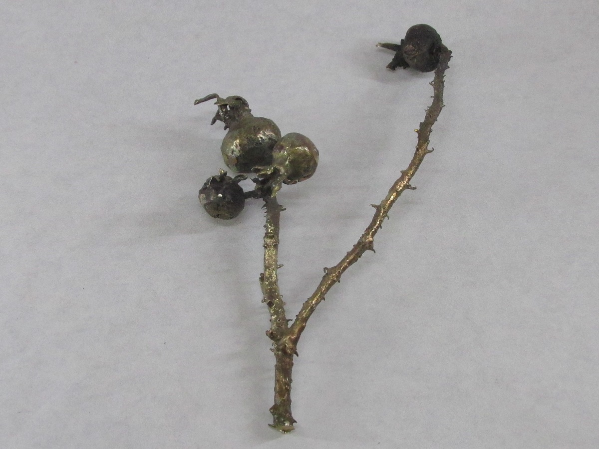 Orgaanivaluna valetut ruusunmarjat varsineen ja piikkeineen. Oksien muoto ja koko vaihteleva, kuten luonnossakin.