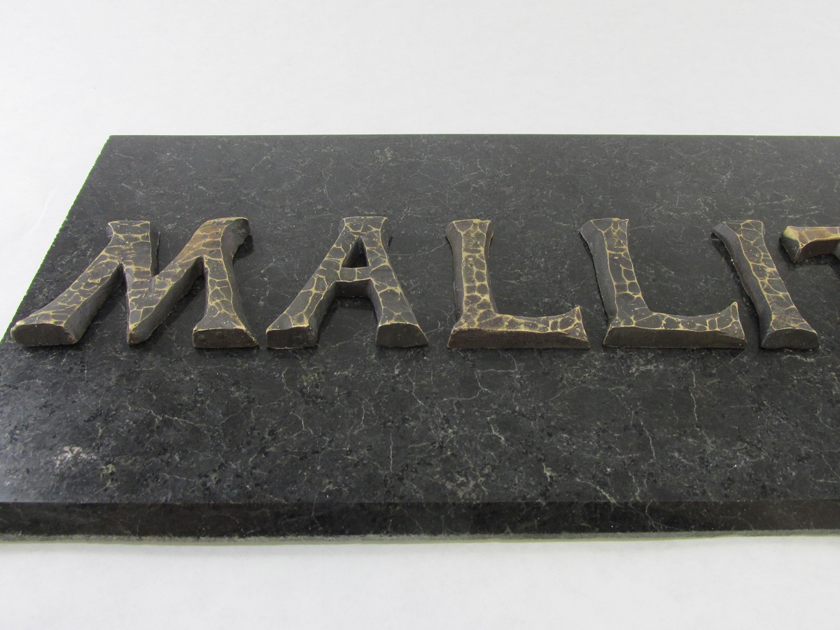 Taotun tyylinen patinoitu pronssikirjain. Saatavilla kaikki suomen kielessä käytetyt kirjaimet A:sta Ö:hön. Kirjainten korkeus 45 mm. Kiinnitys kahdella M3 messinkitapilla. Saatavana lakattuna tai vahattuna.