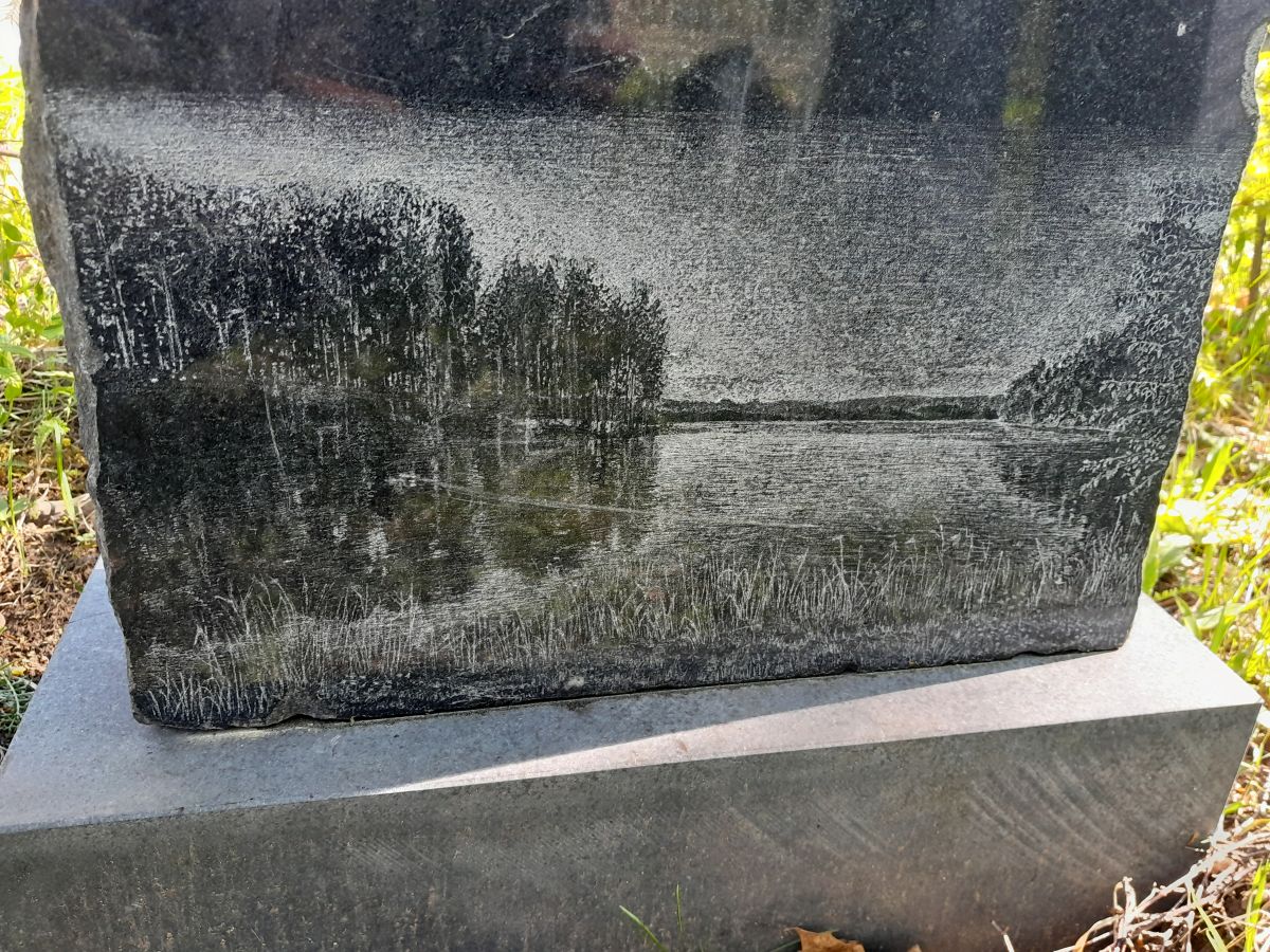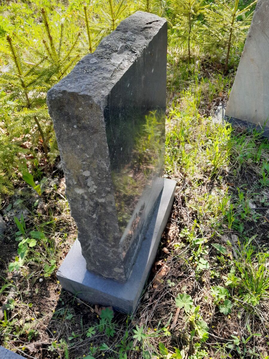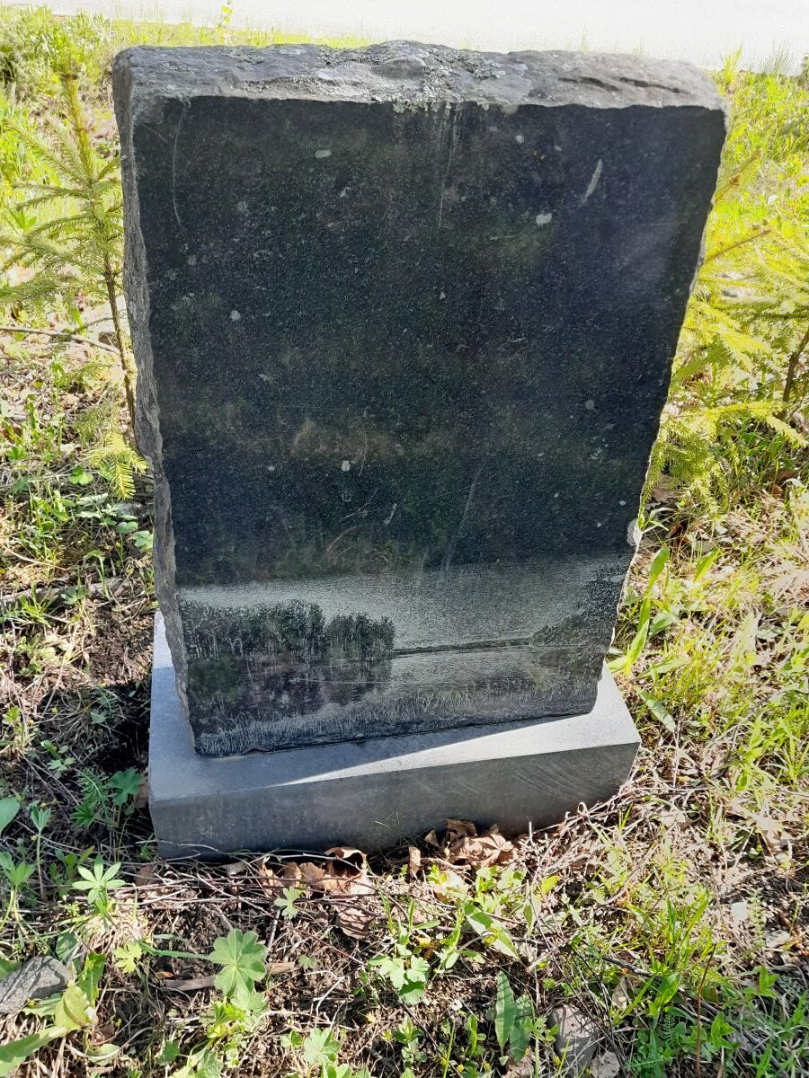 Uusio hautakivi, musta diabaasi, kiilloitettu pinta, lohkotut reunat ja taus.